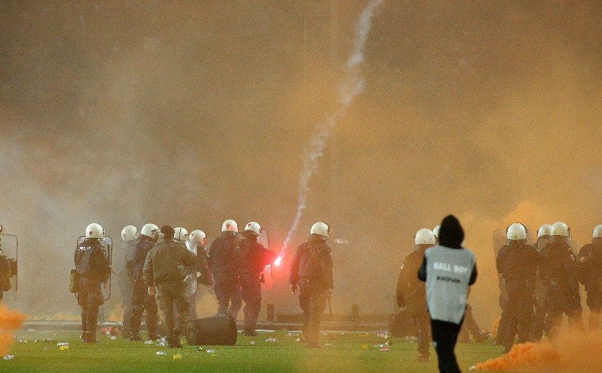 Το ντέρμπι ήταν στο 92ο λεπτό και ο Άρης ήταν μπροστά στο σκορ με το γκολ του Μαντσίνι από το 41′. Ο ΠΑΟΚ πίεζε για να ισοφαρίσει αλλά δεν μπορούσε να δημιουργήσει κάποια φάση και τελικά οι οπαδοί του άρχισαν να πετάνε καπνογόνα, κροτίδες και αντικείμενα στον αγωνιστικό χώρο.