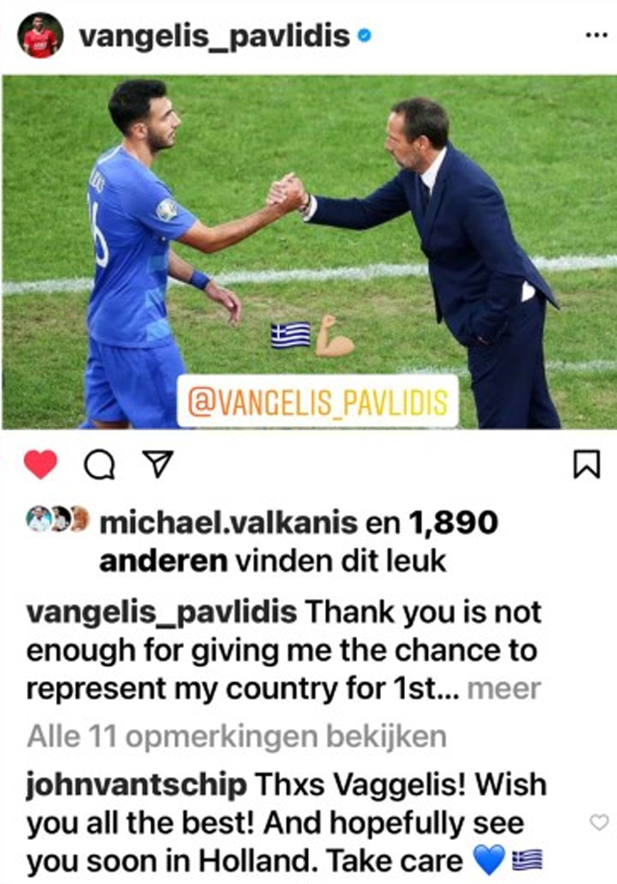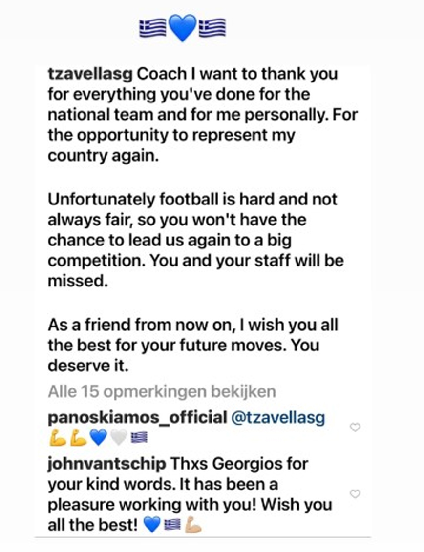 Αντίο είπε μέσω ανάρτησής του στα social media ο Τζον Φαν’τ Σχιπ ευχαριστώντας όσους είναι δίπλα του. Αρκετοί ποδοσφαιριστές της εθνικής Ελλάδος, έστειλαν το δικό τους «αντίο» στον Ολλανδό, πρώην προπονητή της Εθνικής Ελλάδος, μετά το «διαζύγιο» με την «γαλανόλευκη».