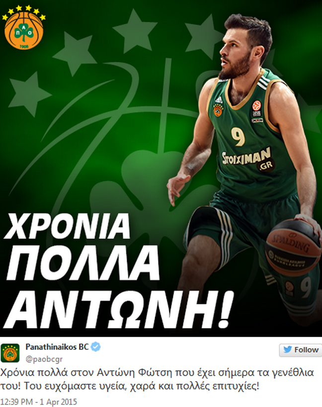 Ο Αντώνης Φώτσης κλείνει σήμερα τα 33 του χρόνια και ο μπασκετικός Παναθηναϊκός έστειλε τις ευχές του από το επίσημο λογαριασμό του στο Twitter.