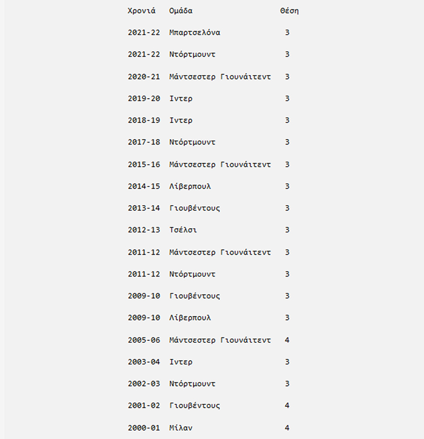 Το Αθηναϊκό Μακεδονικό Πρακτορείο Ειδήσεων παρουσιάζει τον πίνακα με τις πρωταθλήτριες Ευρώπης από τα τέσσερα μεγαλύτερα πρωταθλήματα της Ευρώπης, που δεν τερμάτισαν στις πρώτες δύο θέσεις του ομίλου τους, από το 2000 έως σήμερα.