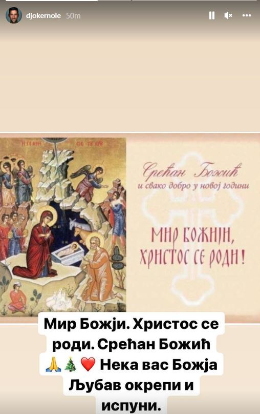 Ο Σέρβος τενίστας έκανε το μεσημέρι της Παρασκευής (7/1) δύο αναρτήσεις στο instagram όπου στη μία είχε την εικόνα από τη γέννηση του Χριστού και στη δεύτερη έστελνε το λιτό του μήνυμα.