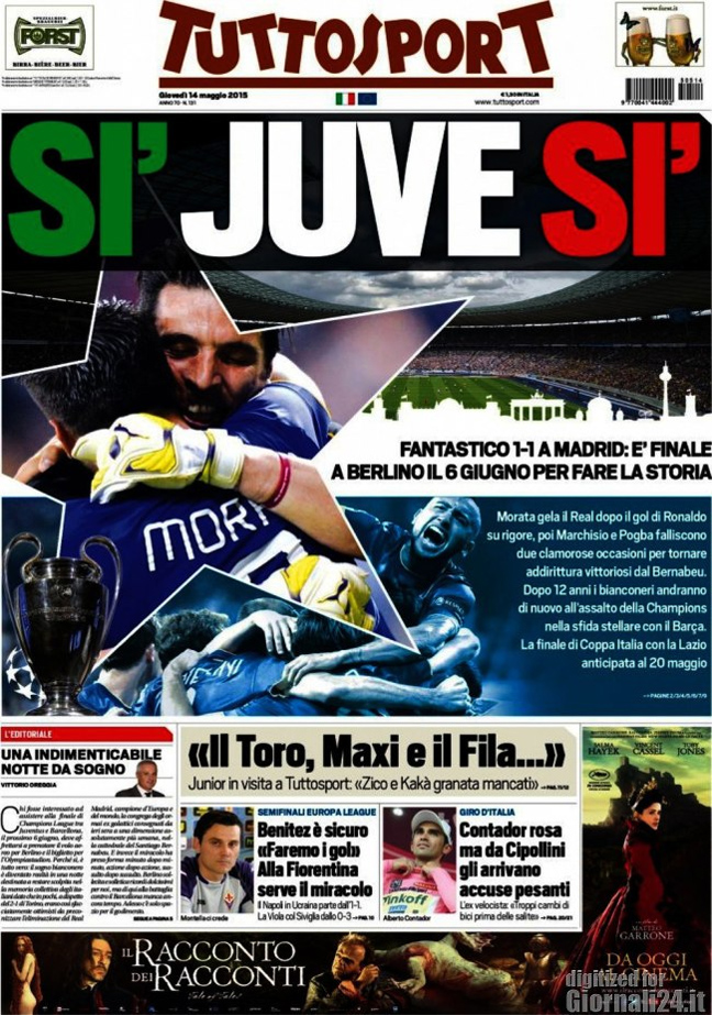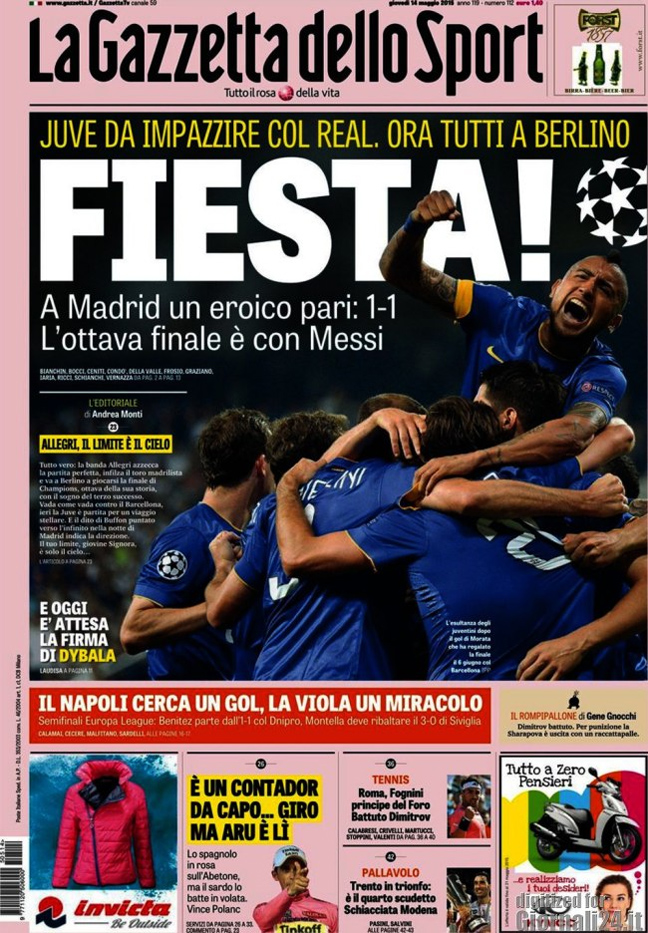 Με αποθεωτικά σχόλια και διθυράμβους κυκλοφόρησαν σήμερα οι ιταλικές εφημερίδες μετά την πρόκριση της Γιουβέντους στον τελικό του Τσάμπιονς Λιγκ!