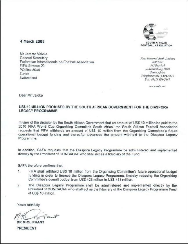 Στην επιφάνεια ήρθε επιστολή της ποδοσφαιρικής ομοσπονδίας της Νοτίου Αφρικής, η οποία απευθύνεται στο δεξί χέρι του Ζεπ Μπλάτερ και ζητεί το παραπάνω ποσό να δοθεί στον πρόεδρο της Συνομοσπονδίας Βόρειας, Κεντρικής Αμερικής και Καραϊβικής (CONCACAF). Θεωρητικά για άλλο σκοπό, αλλά στην ουσία για να υποστηρίξει την υποψηφιότητα της Νοτίου Αφρικής για το Μουντιάλ του 2010…