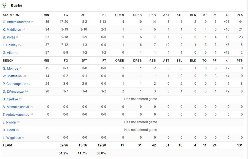 Οι Μπόμπι Πόρτις (23π., 5/9τρ.), Κρις Μίντλετον (21π., 5ριμπ., 4ασ.) και Τζρου Χόλιντεϊ (15π., 10ασ.) στελέχωσαν ιδανικά τον Γιάννη ωστόσο ήταν μηδαμινή η προσφορά του πάγκου των Μιλγουόκι Μπακς έχοντας πετύχει στο σύνολο 16 πόντους (8π., ο Κόνατον και 8π. ο ΝτιΒιντσέντζο).