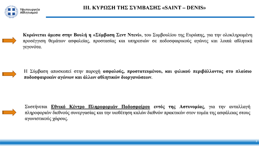 Παράλληλα όπως ανακοίνωσε: «Κυρώνεται αυτήν την εβδομάδα στην Βουλή, η Σύμβαση Σεντ Ντενί του Συμβουλίου της Ευρώπης, για την ολοκληρωμένη προσέγγιση θεμάτων ασφαλείας, προστασίας και υπηρεσιών σε ποδοσφαιρικούς αγώνες και λοιπά αθλητικά γεγονότα.