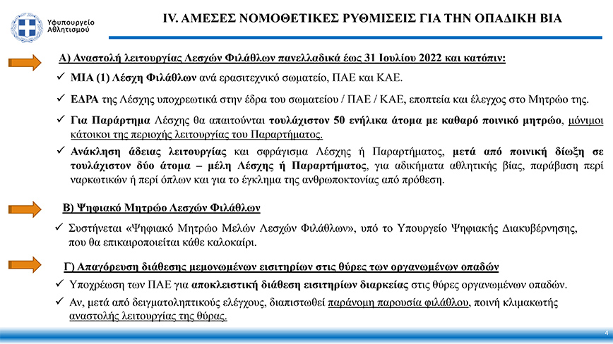 Το Υπουργείο Ψηφιακής Διακυβέρνησης δημιουργεί ψηφιακή πλατφόρμα, με τίτλο «Ψηφιακό Μητρώο Μελών Λεσχών Φιλάθλων», που θα επικαιροποιείται κάθε καλοκαίρι, με ευθύνη των υπευθύνων των Λεσχών. Πιστοποιημένοι χρήστες του Μητρώου είναι: