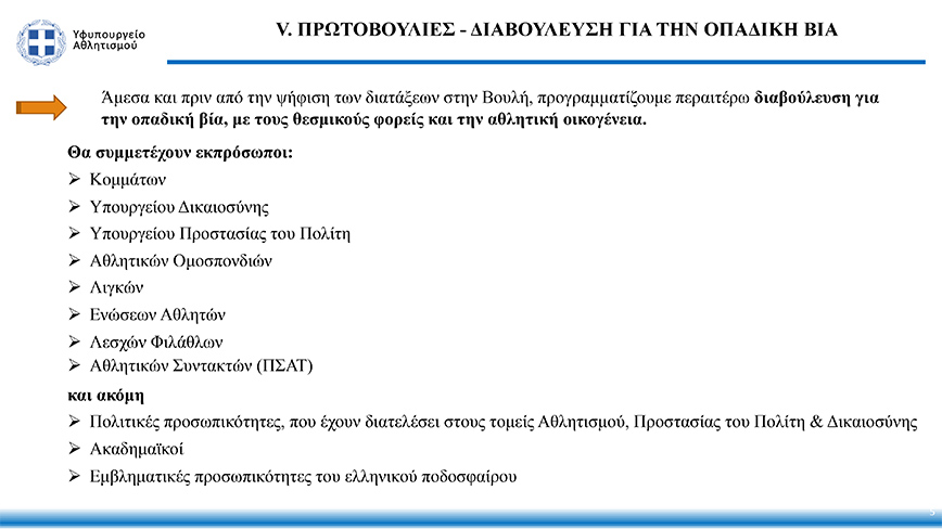 Για τον λόγο αυτό, εντός της εβδομάδας και πριν από την ψήφιση των διατάξεων στην Βουλή, προγραμματίζουμε περαιτέρω διαβούλευση με όλους τους εμπλεκόμενους φορείς και την αθλητική οικογένεια. Πρόθεσή μας είναι η συμμετοχή εκπροσώπων, από όλο το φάσμα του πολιτικού, αθλητικού, οπαδικού και ακαδημαϊκού γίγνεσθαι»« ανέφερε ο κ. Αυγενάκης.