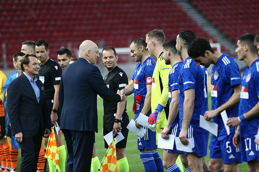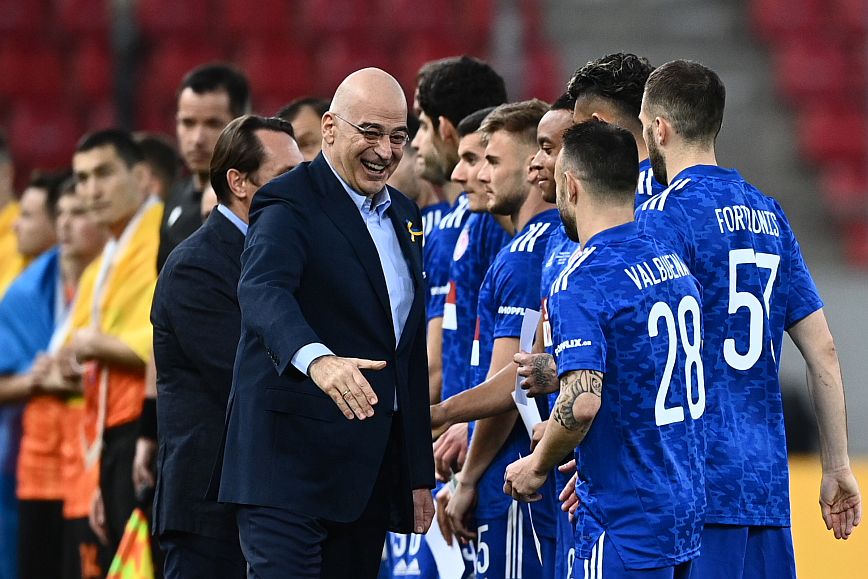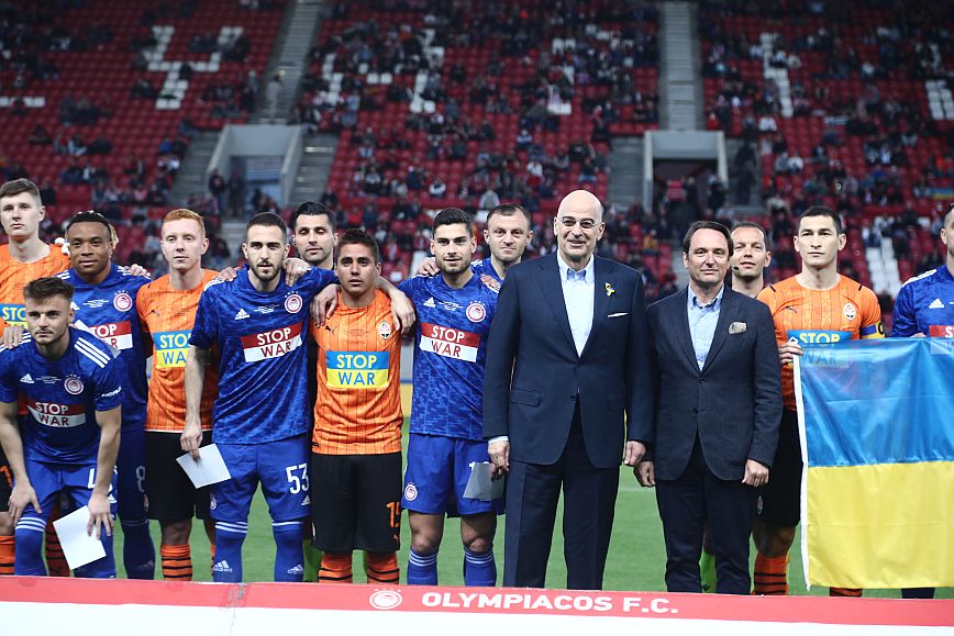 Ο υπουργός Εξωτερικών Νίκος Δένδιας παρακολούθησε μαζί με τον πρέσβη της Ουκρανίας στην Ελλάδα Σεργκέι Σουτένκο τον φιλανθρωπικό ποδοσφαιρικό αγώνα μεταξύ του Ολυμπιακού και της Σαχτάρ, που διεξήχθη στο στάδιο «Γ. Καραϊσκάκης» για την ενίσχυση των Ουκρανών προσφύγων.