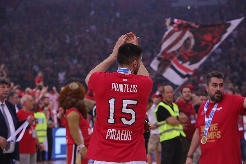 Και οι πρόεδροι της ομάδας του Πειραιά δεν ήταν οι μόνοι… αφού ακολούθησαν οι παίκτες του Γιώργου Μπαρτζώκα, με πρώτον τον Τόμας Ουόκαπ (σ.σ. το νούμερό του είναι το 0, περνούσαν μέσα από τη φυσούνα ακούγοντάς το όνομά τους), φορώντας το ίδιο μπλουζάκι προς τιμή του Γιώργου Πρίντεζη. Αυτό ήταν το τελευταίο παιχνίδι στην καριέρα του Έλληνα πάουερ φόργουορντ… και είχε το ιδανικό τέλος, την κατάκτηση του πρωταθλήματος Ελλάδας.