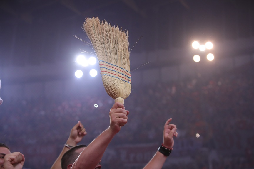 Ο Ολυμπιακός κατέκτησε το 13ο πρωτάθλημα μπάσκετ της ιστορίας του και στο «ΣΕΦ» στήθηκε πάρτι ακόμη και μερικά λεπτά πριν την λήξη του 3ου τελικού κόντρα στον Παναθηναϊκό, στον οποίο οι «ερυθρόλευκοι» νίκησαν με 93-74. Μάλιστα, ορισμένοι οπαδοί κρατούσαν και σκούπες, για να δείξουν στους παίκτες των «πρασίνων» ότι η αγαπημένη τους ομάδα τους… σκούπισε.