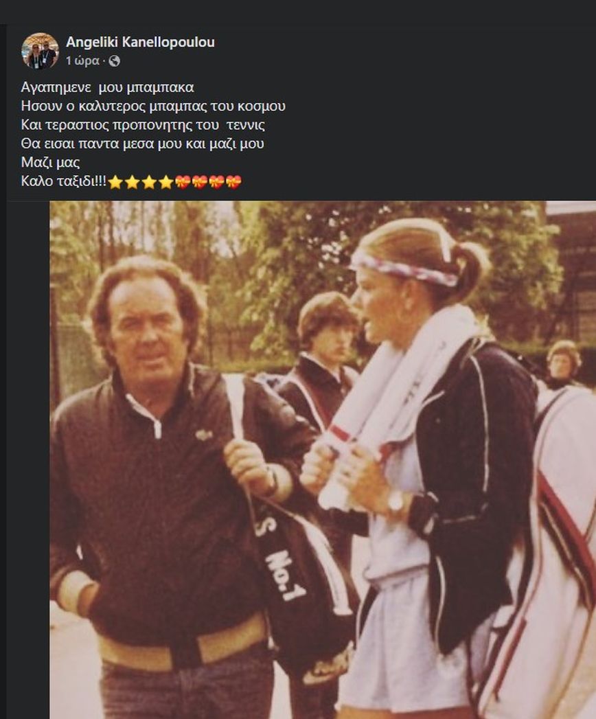 «Αγαπημένε μου μπαμπάκα. Ήσουν ο καλύτερος μπαμπάς του κόσμου και τεράστιος προπονητής του τένις. Θα είσαι πάντα μέσα μου και μαζί μου. Μαζί μας. Καλό ταξίδι», ανέφερε στην ανάρτηση που έκανε στα μέσα κοινωνικής δικτύωσης.