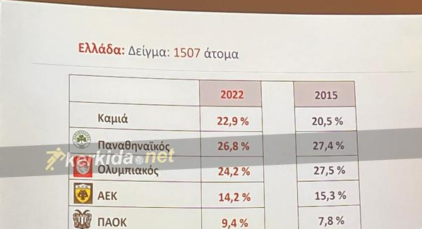 Στην 3η θέση ήταν και τότε η ΑΕΚ αλλά με ποσοστό 15,3%, μεγαλύτερο δηλαδή από το φετινό, ενώ ο ΠΑΟΚ ήταν 4ος με 7,8%. Με λίγα λόγια δηλαδή, όπως δείχνουν οι αριθμοί, οι Θεσσαλονικείς είναι οι μόνοι που ανέβασαν τα ποσοστά τους σε σχέση με το 2015, αφού ερυθρόλευκοι, πράσινοι και κιτρινόμαυροι παρουσιάζουν πτώση σε σχέση με πριν 7 χρόνια.