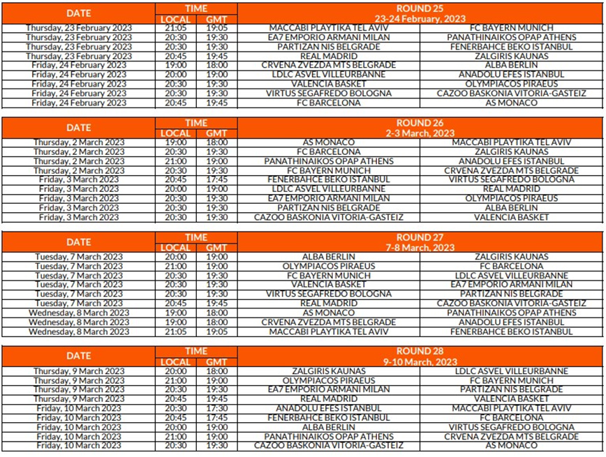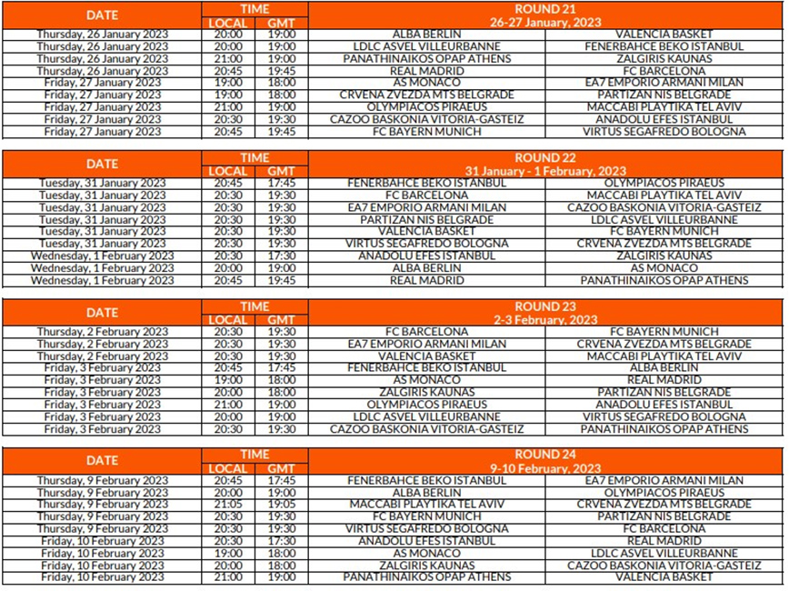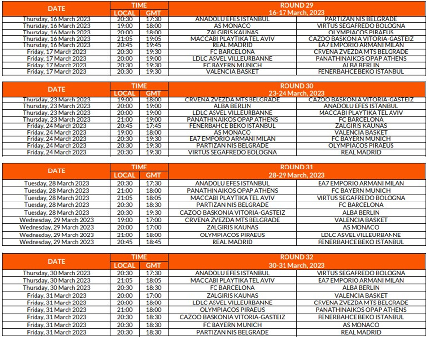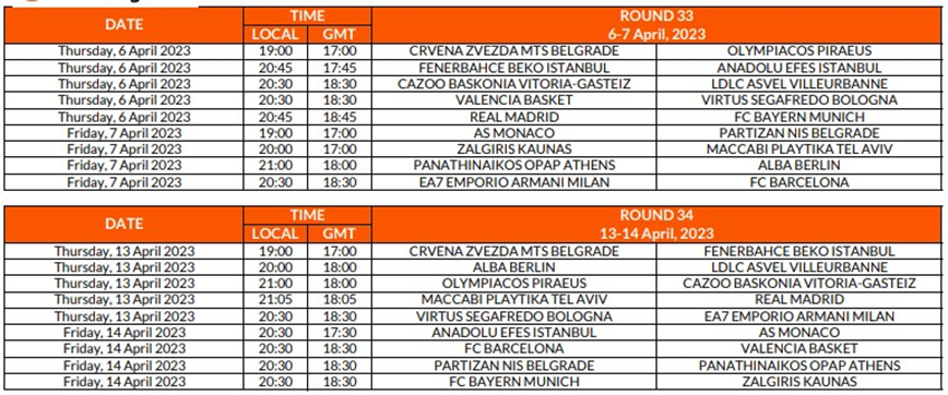 Η ομάδα του Μπαρτζώκα θα κλείσει τις υποχρεώσεις του στις 13 Απρίλη για τη Regular Season, αφού θα υποδεχθεί τη Μπασκόνια στο ΣΕΦ. Στον αντίποδα το σύνολο του Ντέγιαν Ράντονιτς θα παίξει με την Παρτιζάν του Ομπράντοβιτς στις 14 Απρίλη στο Βελιγράδι.