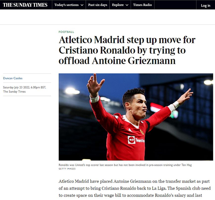 Τα σενάρια λοιπόν συνεχίζονται και το τελευταίο μέχρι στιγμής επεισόδιο της υπόθεσης δείχνει έξοδο Γκριεζμάν από την Ατλέτικο για χάρη του Ρονάλντο. Πιο συγκεκριμένα, οι «Times» του Λονδίνου, αναφέρουν πως ο Γάλλος επιθετικός μπαίνει σε καθεστώς πώλησης, έτσι ώστε να βρεθεί χώρος στο ρόστερ αλλά και στα… συμβόλαια για τον κάτοχο των πέντε Champions league.