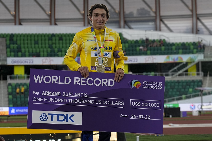 Ο χώρος του αθλητισμού ασχολείται με τον Μόντο Ντουπλάντις, καθώς ο 20χρονος Σουηδός αθλητής πέτυχε μια μοναδική εμφάνιση στο στο Παγκόσμιο πρωτάθλημα στίβου στο Όρεγκον, αφού στο άλμα επί κοντώ κατέρριψε το παγκόσμιο ρεκόρ.