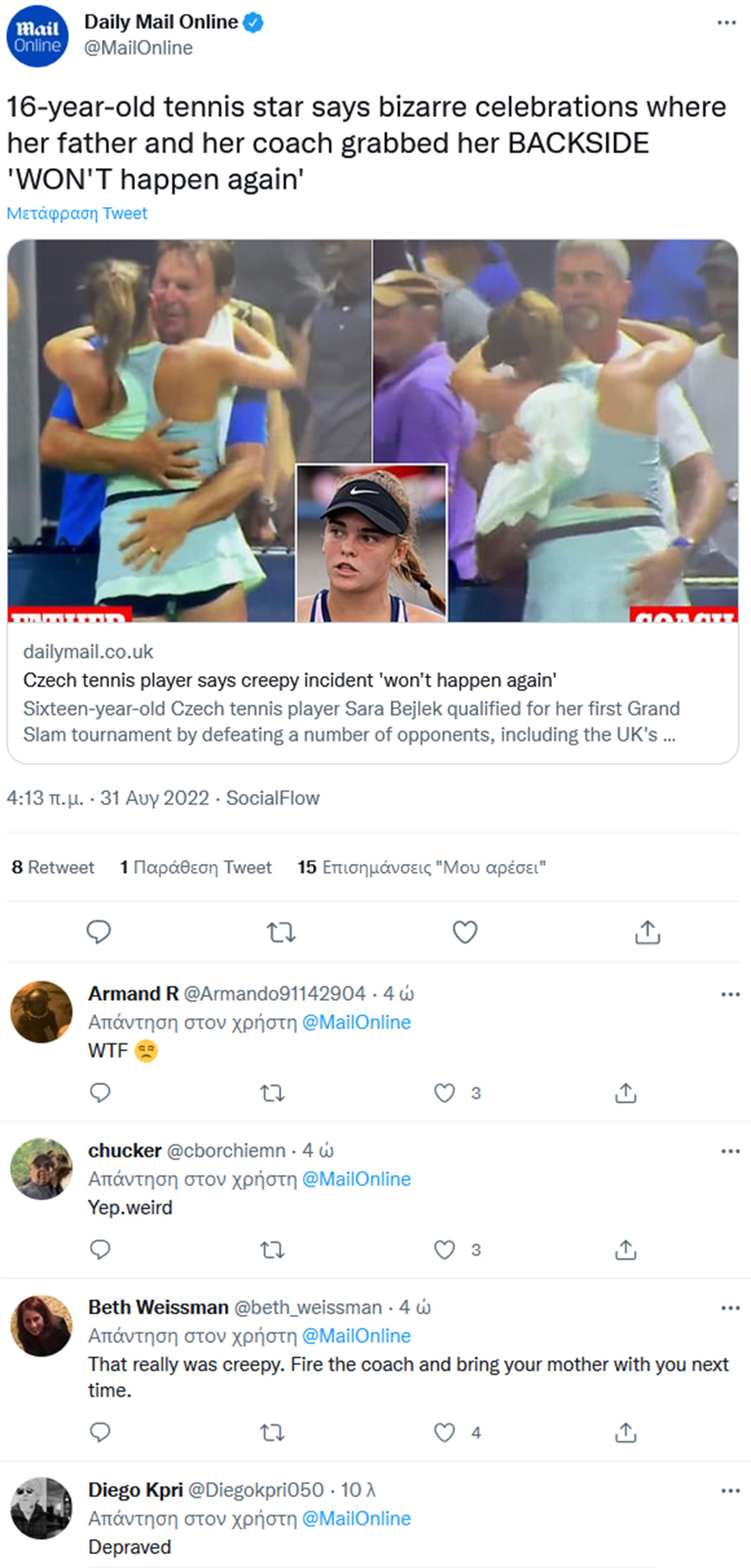 «Η WTA πρέπει να τα εξετάσει αυτά, ειδικά από τη στιγμή που αυτά τα νεαρά κορίτσια ταξιδεύουν με άντρες από πολύ μικρή ηλικία. Επίσης, μπορείτε να πείτε ότι φταίει ο μπαμπάς ή το wtv, αλλά ο μπαμπάς σας αγγίζει έτσι τον πισινό σας;», φέρεται να έγραψε ένας άλλος χρήστης στο twitter.