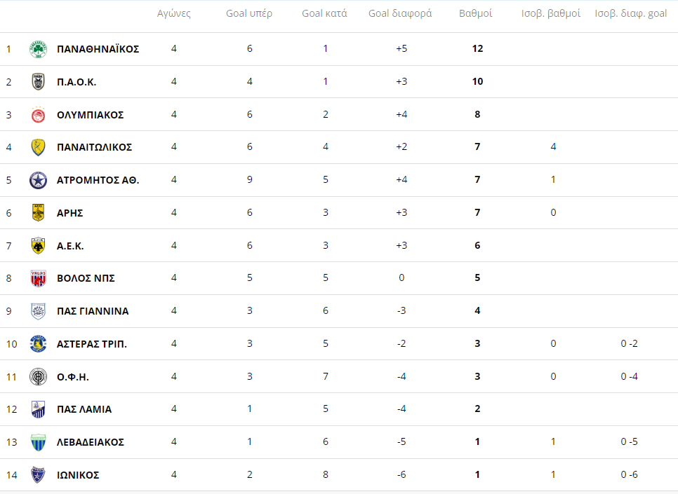 Μετά την ολοκλήρωση της 4ης αγωνιστικής της Super League και το 1-0 του ΠΑΟΚ επί της Λαμίας στην Τούμπα, ο Παναθηναϊκός συνεχίζει να οδηγεί την κούρσα του πρωταθλήματος με το 4Χ4 και οι Θεσσαλονικείς να ακολουθούν στη 2η θέση με δύο βαθμούς διαφορά.