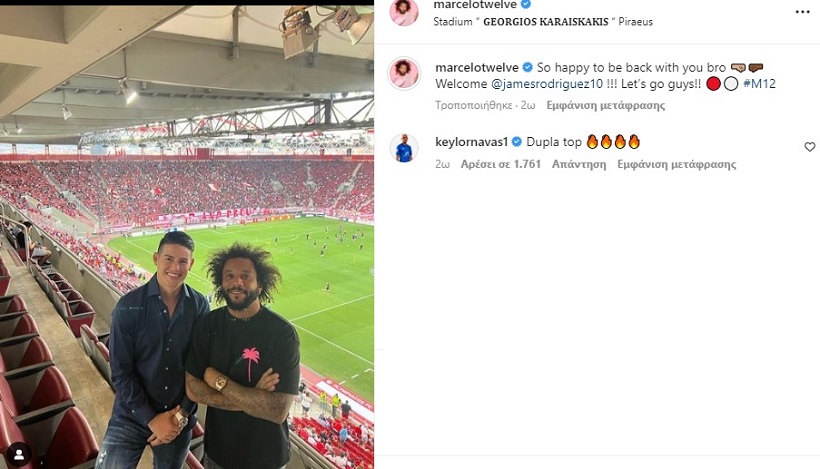Ο Μαρσέλο τώρα δημοσίευσε στα social media μία ακόμη φωτογραφία στα social media, αυτή με τον Βαγγέλη Μαρινάκη και τον Χάμες Ροντρίγκες την ώρα της ανακοίνωσης της απόκτησης του Κολομβιανού, με τον Βραζιλιάνο να γράφει «Κοιτάξτε ποιος είναι εδώ».