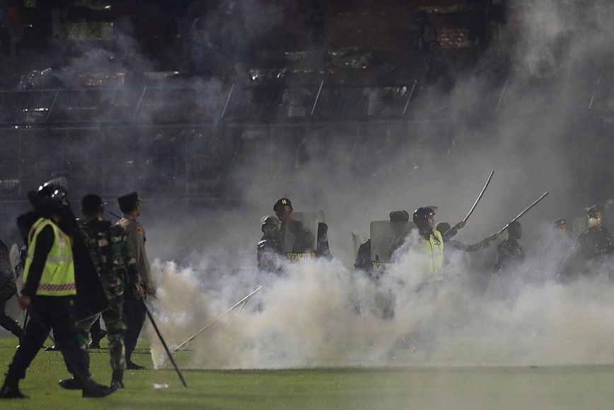 Τα δακρυγόνα απαγορεύονται από τη FIFA. Όταν η αστυνομία έκανε χρήση ο δυνατός αέρας συγκέντρωσε ένα σύννεφο χημικών στο κέντρο του σταδίου με αποτέλεσμα να προκληθεί πανικός’.