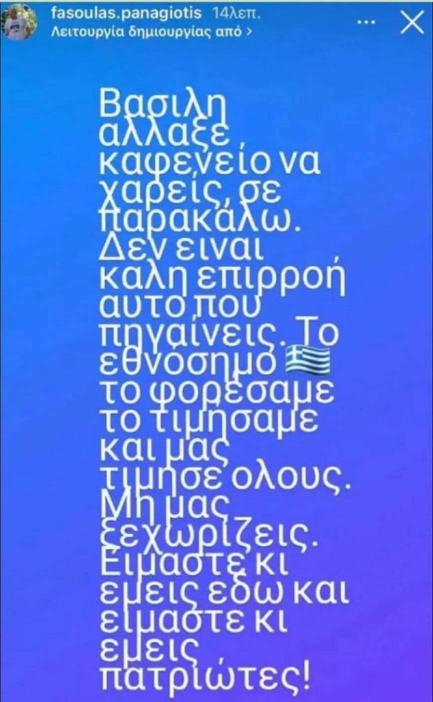 Αναλυτικά στο story του, ο Παναγιώτης Φασούλας ανέφερε: «Βασίλη άλλαξε καφενείο να χαρείς σε παρακαλώ. Δεν είναι καλή επιρροή αυτό που πηγαίνεις. Το εθνόσημο το φορέσαμε, το τιμήσαμε και μας τίμησε όλους. Μην μας ξεχωρίζεις. Είμαστε κι εμείς εδώ κι είμαστε κι εμείς πατριώτες».