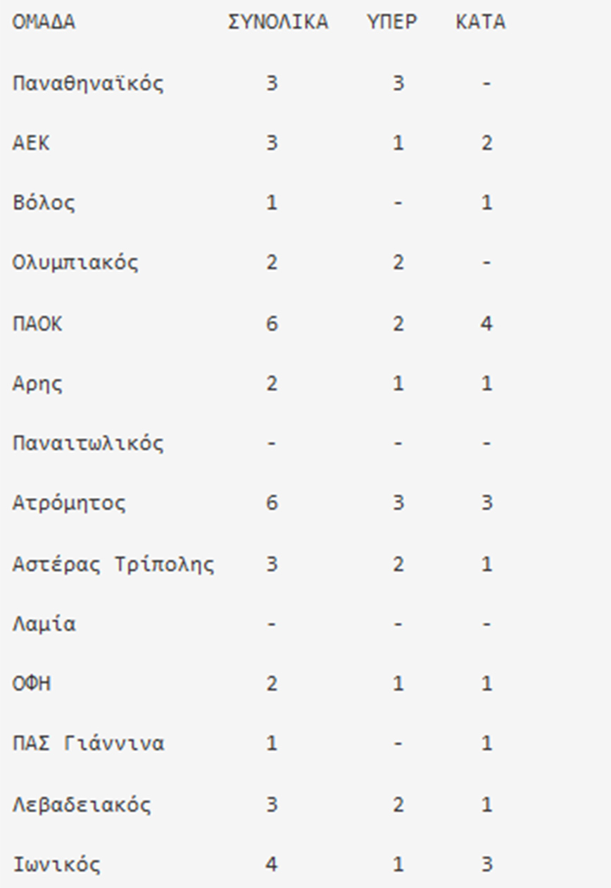 Οι επιδόσεις των 14 συλλόγων της Super League στις καθυστερήσεις του πρώτου (45’+) και του δεύτερου ημιχρόνου (90’+), αναφορικά με τα γκολ που σημειώνουν ή δέχονται: