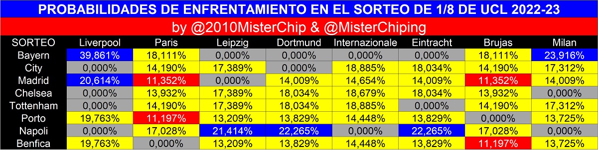 Το δεύτερο ζευγάρι με τις περισσότερες πιθανότητες είναι το Μπάγερν Μονάχου-Μίλαν (23,916%). Ακολουθούν αυτά της Νάπολι με την Άιντραχτ Φρανκφούρτης (22,265%) και την Ντόρτμουντ (22,265%) καθώς και εκείνο μεταξύ των «παρτενοπέι» με την Λειψία (21,414%). Επίσης, ποσοστό άνω του 20% έχει και το ζευγάρι Ρεάλ Μαδρίτης-Λίβερπουλ (20,614%), που ήταν και το ζευγάρι του τελικού της σεζόν 2021-22.