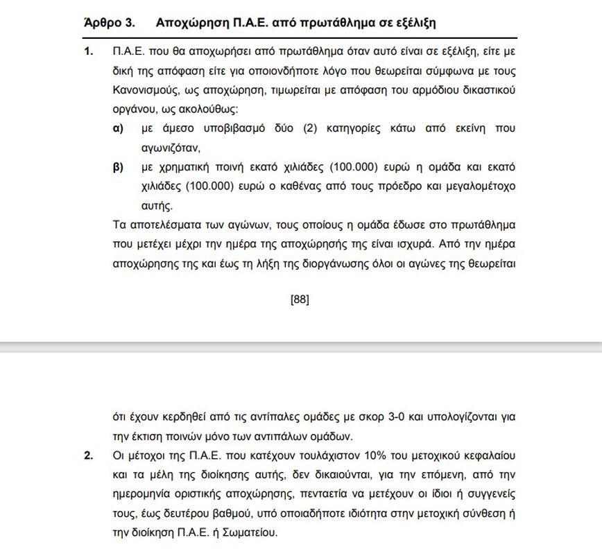 Εκεί λοιπόν αναφέρει πως αν μία ομάδα αποφασίσει να αποχωρήσει από τη διοργάνωση, τότε αυτομάτως υποβιβάζεται 2 κατηγορίες, ενώ παράλληλα επιβάλλεται πρόστιμο 100.000 ευρώ στον πρόεδρο και στον μεγαλομέτοχό της.