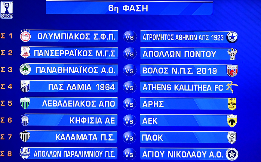 Δύο ντέρμπι στην φάση των «8» του Κυπέλλου Ελλάδας έβγαλε η κληρωτίδα, όπου ο Παναθηναϊκός θα αντιμετωπίσει τον ΠΑΟΚ και ο Άρης τον Ολυμπιακό. Στην κλήρωση των «16» τα πράγματα κύλησαν πιο… αδάφορα αφού οι Big-5 έπεσαν οι τρεις με ομάδες της Superleague και οι δύο με ομάδες από την δεύτερη τη τάξει κατηγορία.