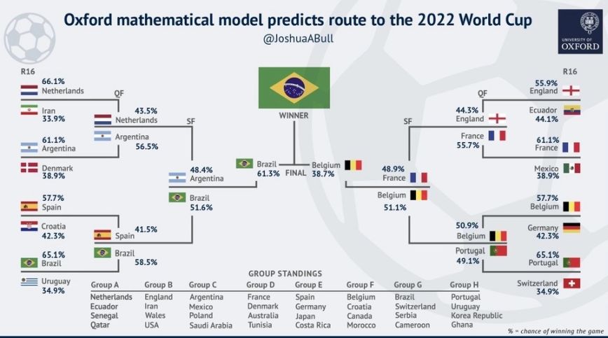 Το Παγκόσμιο Κύπελλο είναι προ των πυλών, με το Πανεπιστήμιο της Οξφόρδης να εφαρμόζει το μαθηματικό του μοντέλο για να καταλήξει στην ομάδα που θα φύγει με το τρόπαιο από το Κατάρ.
