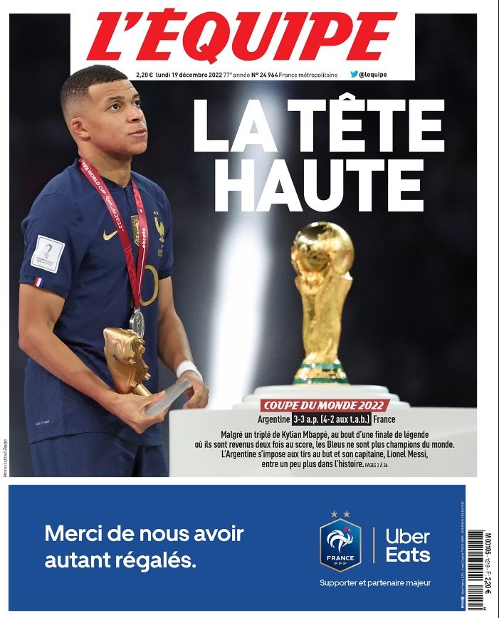 Η Equipe αφιέρωσε το εξώφυλλο της Δευτέρας στον… Κιλιάν Εμπαπέ δίπλα στο τρόπαιο του Μουντιάλ 2022, έπειτα από την ήττα της Γαλλίας από την Αργεντινή στον τελικό.