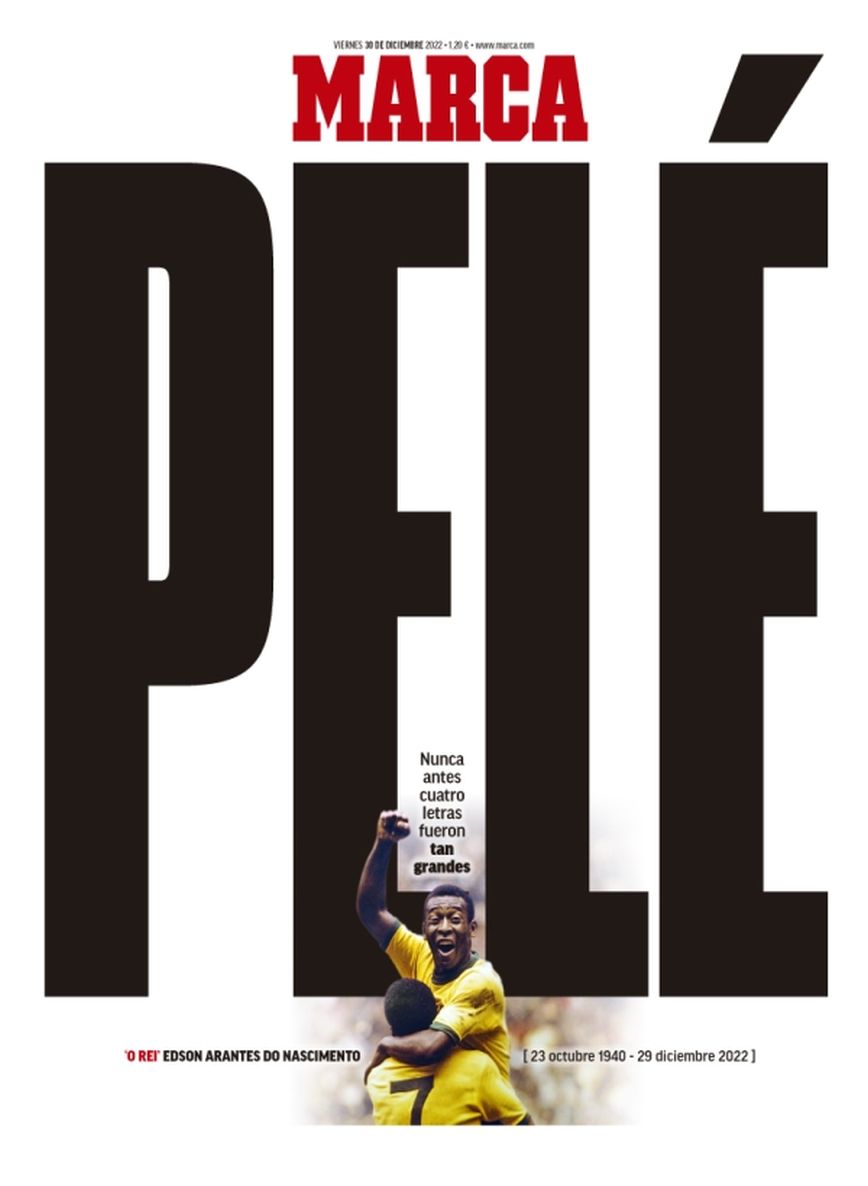 Η ισπανική αθλητική εφημερίδα «Marca» αποχαιρετά τον θρύλο του παγκόσμιου ποδοσφαίρου Πελέ, ο οποίος έφυγε από τη ζωή το απόγευμα της Πέμπτης (29/12) σε ηλικία 82 ετών, έπειτα από τεράστια μάχη με τον καρκίνο.