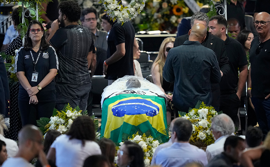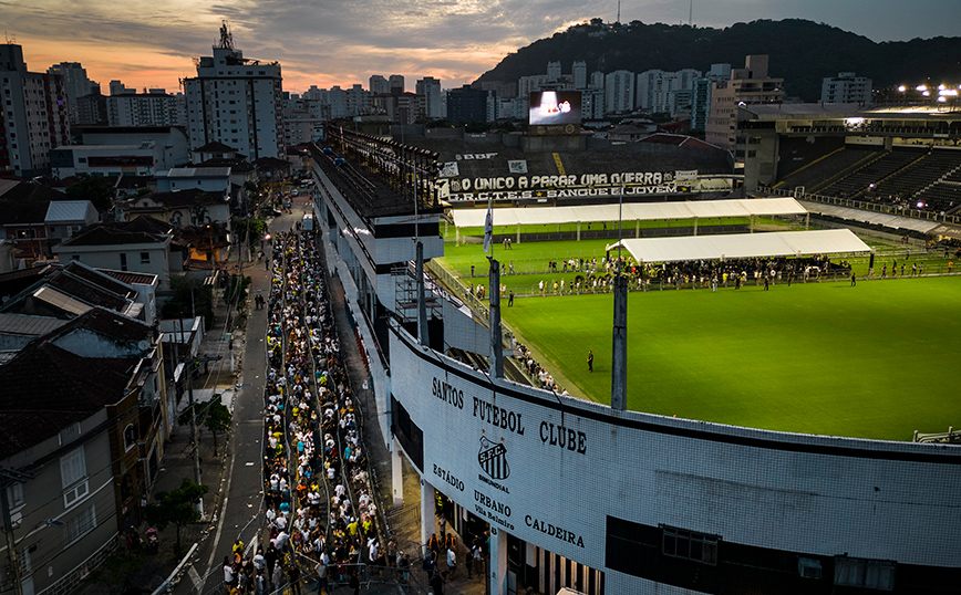 Οι Βραζιλιάνοι αποχαιρετούν τον Πελέ, αποδίδοντας φόρο τιμής στον θρύλο του ποδοσφαίρου μετά τον θάνατό του σε ηλικία 82 ετών, περνώντας μπροστά από το φέρετρό του που βρίσκεται στο κέντρο του γκαζόν του γηπέδου των μεγάλων κατορθωμάτων του «Βασιλιά» του ποδοσφαίρου, στη Σάντος.