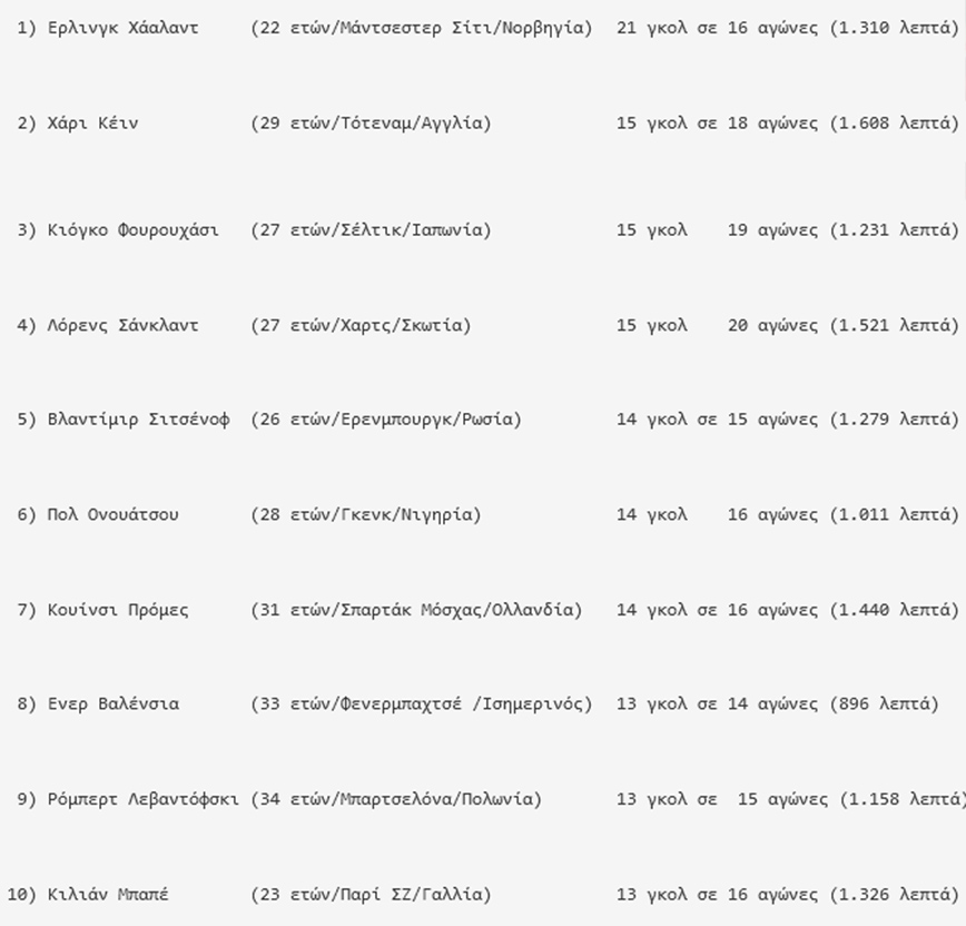 Ο Ερλινγκ Χάαλαντ, παραμένει επικεφαλής στον πίνακα με τους κορυφαίους σκόρερ στην Ευρώπη. Ο νεαρός Νορβηγός επιθετικός, έχει σκοράρει 21 φορές σε 16 συμμετοχές, καθώς με την επανέναρξη των πρωταθλημάτων, μετά το τέλος του Μουντιάλ, «βρήκε δίχτυα» δύο φορές απέναντι στην Λιντς (3-1) και μία φορά με αντίπαλο την Εβερτον (1-1).