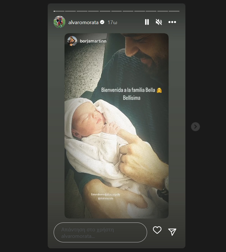 «Η Μπέλα γεννήθηκε στις 9 του μήνα και είναι υπέροχη. Η μαμά δυστυχώς και αφού η γέννα πήγε πολύ καλά, είχε επιπλοκές που μας τρόμαξαν. Αυτή τη στιγμή βρίσκεται στη ΜΕΘ της Κλινικής του Πανεπιστημίου Navarra όπου τη φροντίζουν οι καλύτεροι γιατροί και σιγά-σιγά αναρρώνει. Είναι πολύ δυνατή» έγραψε ο Μοράτα στην πρώτη ανάρτησή του.