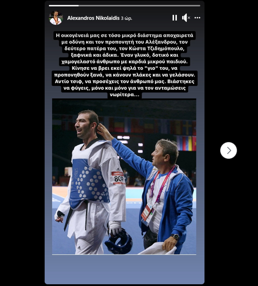 «Η οικογένειά μας σε τόσο μικρό διάστημα αποχαιρετά με οδύνη και τον προπονητή του Αλέξανδρου, τον δεύτερο πατέρα του, τον Κώστα Τζιδημόπουλο, ξαφνικά και άδικα. Έναν γλυκό, δοτικό και χαμογελαστό άνθρωπο με καρδιά μικρού παιδιού. Κίνησε να βρει εκεί ψηλά το “γιο” του, να προπονηθούν ξανά, να κάνουν πλάκες και να γελάσουν. Αντίο τσιφ, να προσέχεις τον άνθρωπό μας. Βιάστηκες να φύγεις, μόνο και μόνο για να τον ανταμώσεις νωρίτερα…» αναφέρεται στην ανάρτηση της οικογένειας του Αλέξανδρου Νικολαΐδη.