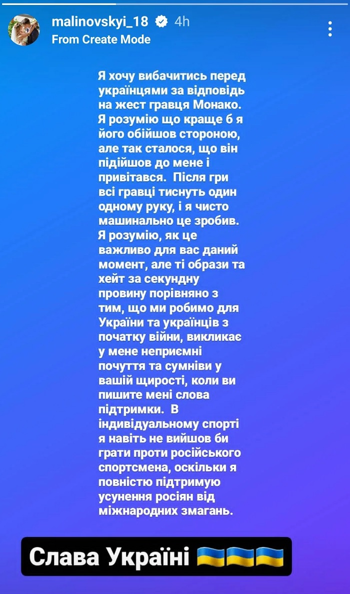 «Θέλω να ζητήσω συγνώμη από όλους τους Ουκρανούς για την αντίδρασή μου στην κίνηση του ποδοσφαιριστή της Μονακό», έγραψε ο Μαλινόφσκι και συνέχισε: «Αντιλαμβάνομαι πως θα έπρεπε να τον είχα αποφύγει, αλλά έτυχε να έρθει προς το μέρος μου και είπε “γεια”. Μετά το τέλος του αγώνα, όπως συνηθίζεται, όλοι ποδοσφαιριστές δίνουν τα χέρια μεταξύ τους και έτσι έκανα και εγώ, εντελώς μηχανικά.