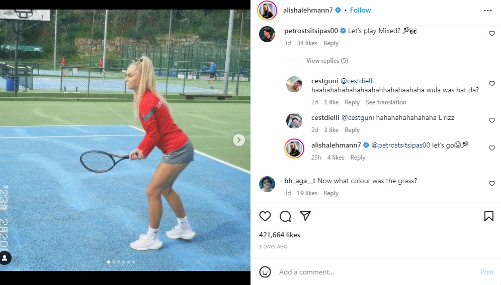 Ο Πέτρος Τσιτσιπάς, αδερφός του Στέφανου Τσιτσιπά, επίσης τενίστας, με αφορμή μια σειρά από φωτογραφίες της Αλίσα Λέμαν, όπου έπαιζε τένις της έκανε μια πρόταση να παίξουν μαζί… διπλό. Η Λέμαν είναι παίκτρια της Άστον Βίλα και μια από τις διασημότερες αθλήτριες της Ελβετίας στα social media.