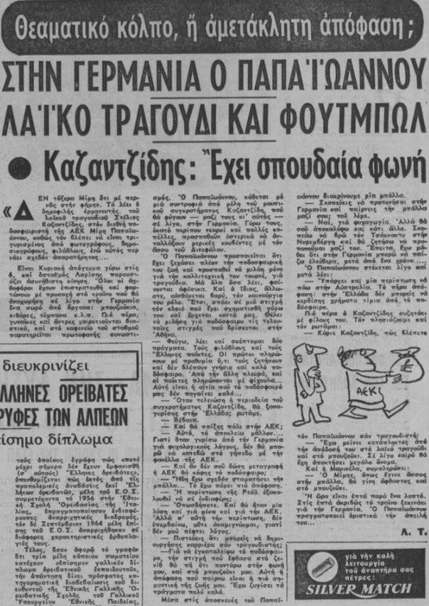 Ο Μίμης Παπαϊωάννου επέστρεψε στην ΑΕΚ και με τη διοίκηση να του προσφέρει ένα πολύ μεγάλο συμβόλαιο αποφάσισε πως θα μείνει για πάντα στη Νέα Φιλαδέλφεια για να εξελιχθεί σε έναν θρύλο των «κιτρινόμαυρων» και να τραγουδήσει και τον ύμνο της ομάδας. Η ιδέα είχε γεννηθεί από τον Χρήστο Νικολόπουλο κατά την περιοδεία στη Γερμανία και παίχτηκε για πρώτη φορά μέσα σε ένα τρένο. Ο Καζαντζίδης συνέθεσε τη μουσική, ο Κολοκοτρώνης έγραψε τους στίχους, ο Νικολόπουλος έπαιξε το μπουζούκι και ο Παπαϊωάννου τραγούδησε: «Εμπρός της ΑΕΚ παλικάρια…»