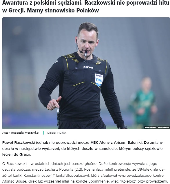 «Τα ελληνικά μέσα ενημέρωσης αναφέρουν ότι οι Πολωνοί διαιτητές, έκαναν χρήση αλκοόλ ενώ ήταν στο αεροπλάνο για την Ελλάδα και ήταν επιθετικοί προς τους συνεπιβάτες τους. Έγινε μάλιστα καυγάς. Ο καυγάς, σύμφωνα με αυτές τις μαρτυρίες, συνεχίστηκε και στο αεροδρόμιο. Ένας από τους διαιτητές φέρεται να έφτυσε έναν Έλληνα με τον οποίο είχε λογομαχήσει στο στο αεροπλάνο. Η αστυνομία επενέβη στην αίθουσα αφίξεων. Εμφανίστηκε και απεσταλμένος της τοπικής ομοσπονδίας και προσπάθησε να εξομαλύνει τα πράγματα.