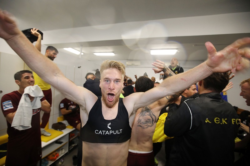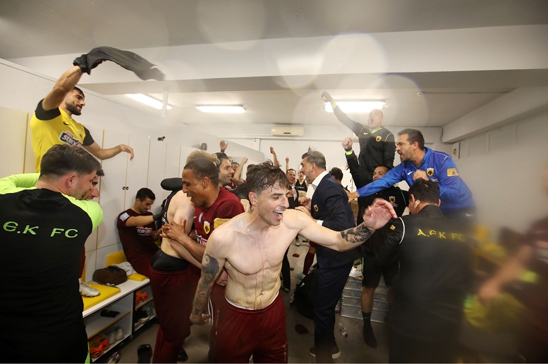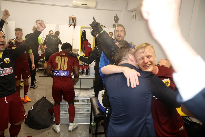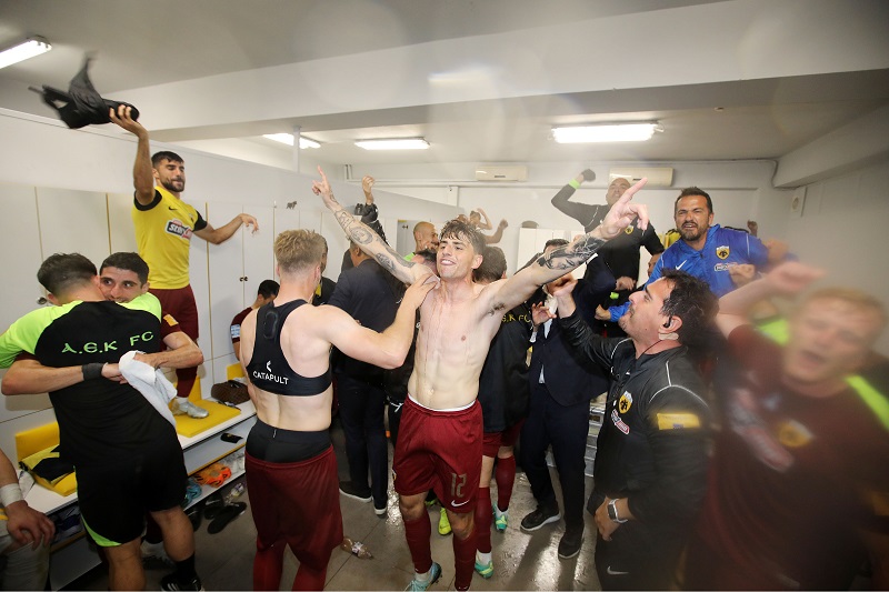 Μετά το τέλος του ματς στη Θεσσαλονίκη για την 9η και προτελευταία αγωνιστική των πλέι οφ της Stoiximan Super League, οι παίκτες της ΑΕΚ το πανηγύρισαν με την ψυχή τους τόσο στο γήπεδο… χορεύοντας υπό βροχή όσο και στα αποδυτήρια του «Κλεάνθης Βικελίδης». Πλέον η ομάδα του Ματίας Αλμέιδα χρειάζεται ένα βαθμό με τον Βόλο για να κλειδώσει και μαθηματικά τον τίτλο.