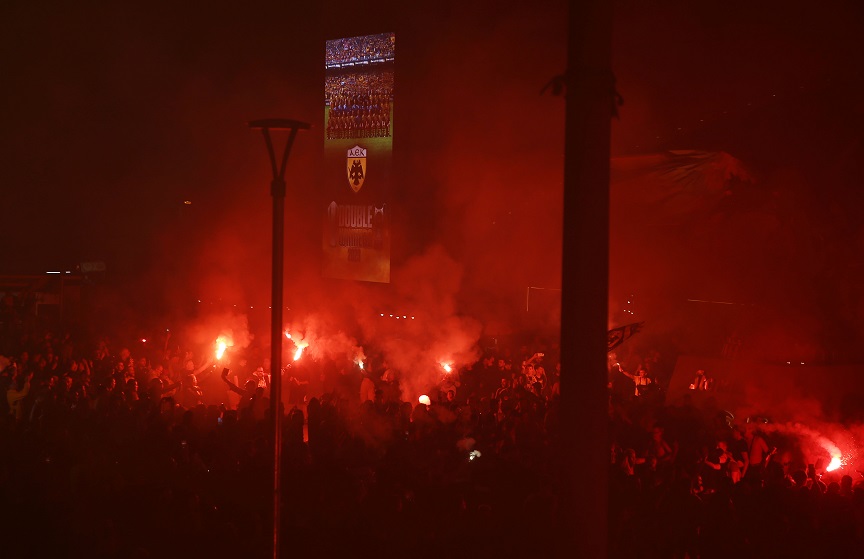 Για 3η φορά στην ιστορία της η ΑΕΚ κάνει το… διπλό, δηλαδή να πάρει πρωτάθλημα και Κύπελλο μαζί στην ίδια σεζόν κι αυτό οδήγησε σε έξαλλους πανηγυρισμούς στο «σπίτι της», όπου χιλιάδες οπαδοί της βρέθηκαν από νωρίς το απόγευμα της Τετάρτης (24/5) και παρακολούθησαν εκεί τη νίκη με 2-0 επί του ΠΑΟΚ στον τελικό.