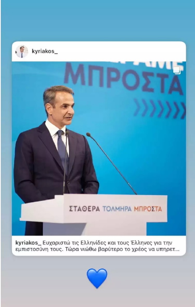 Η Ελληνίδα πρωταθλήτρια του τένις «πόσταρε» μια γαλάζια καρδιά στο μήνυμα του πρωθυπουργού της Ελλάδας μετά την επανεκλογή του.