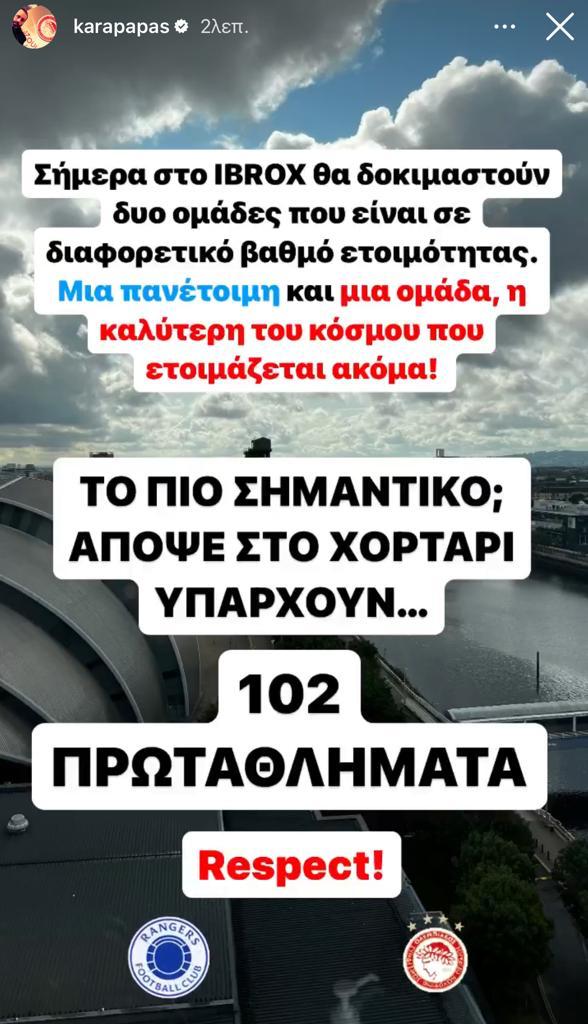 Ο αντιπρόεδρος του Ολυμπιακού, Κώστας Καραπαπάς, με ανάρτησή του αναφέρθηκε στο φιλικό. Έγραψε χαρακτηριστικά: «Σήμερα στο Ibrox θα δοκιμαστούν δύο ομάδες που είναι σε διαφορετικό βαθμό ετοιμότητας. Μια πανέτοιμη και μια ομάδα, η καλύτερη του κόσμου που ετοιμάζεται ακόμα! Το πιο σημαντικό; Απόψε στο χορτάρι υπάρχουν… 102 πρωταθλήματα. Respect!»