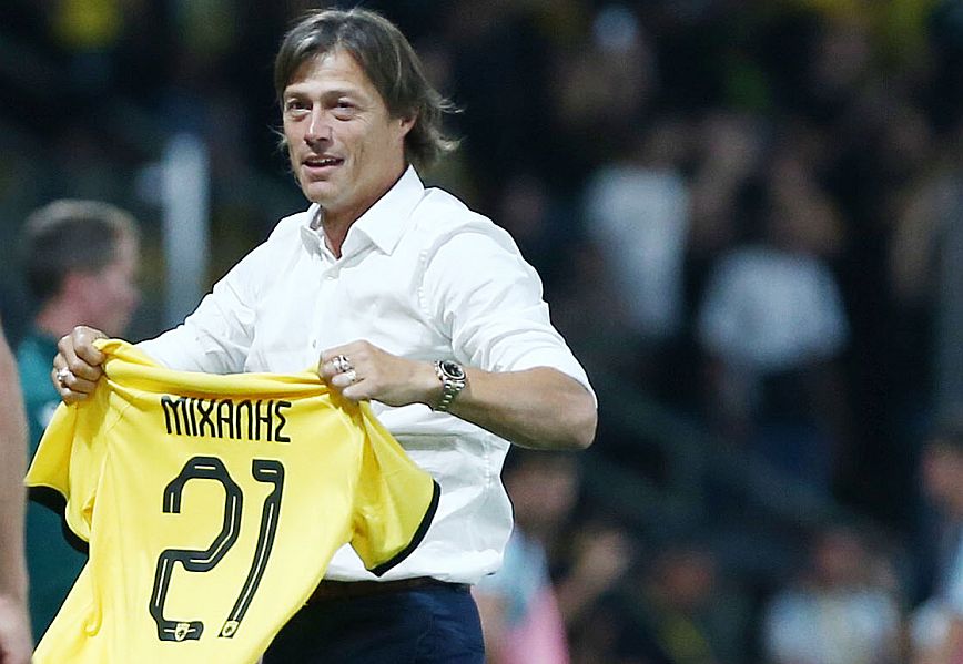 Με τη λήξη του αγώνα και με τους έντονους πανηγυρισμούς ο Ματίας Αλμέιδα, ύψωσε στον ουρανό τη φανέλα με το Νο21 και το όνομα του Μιχάλη, την ώρα που τον είχε σηκώσει στις πλάτες του ο Άμραμπατ.