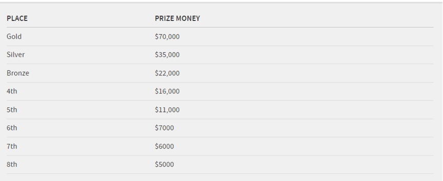 Το χρυσό μετάλλιο στο παγκόσμιο πρωτάθλημα παίρνει 70.000 δολάρια, το αργυρό 35.000 δολάρια και το χάλκινο 22.000 ενώ ακολουθούν μέχρι την 8η θέση τα ποσά των 16.000, 11.000, 7.000, 6.000 και 5.000 δολάρια, αντίστοιχα.