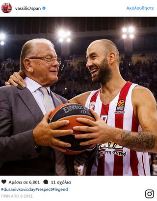 Ο αρχηγός του Ολυμπιακού, που έζησε τη γεμάτη συναίσθημα εκδήλωση στο ΣΕΦ από το παρκέ, εξέφρασε για πολλοστή φορά τον σεβασμό του για τον Σέρβο τεχνικό, με δύο φωτογραφίες στο Instagram. Οι δύο τους εμφανίζονται μαζί και στις δύο περιπτώσεις, με τον «Kill Bill» να τις συνοδεύει με τις λέξεις «σεβασμός» και «Θρύλος».
