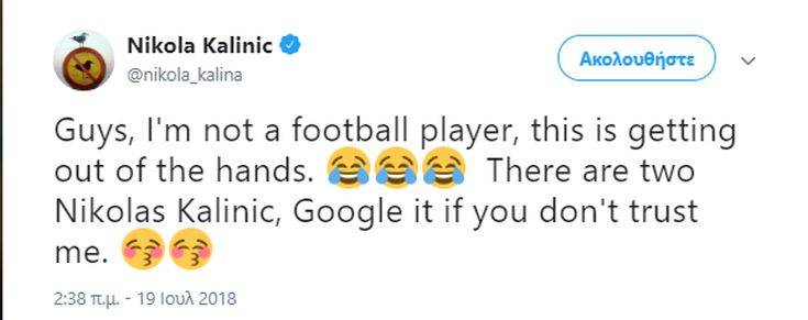 Δεν είναι λίγοι οι άνθρωποι που έχουν ίδιο όνομα και επώνυμο με κάποιους άλλους, χωρίς να είναι απαραίτητα συγγενείς τους. Όμως, στην περίπτωση των δύο Νίκολα Κάλινιτς, του ποδοσφαιριστή της Μίλαν και του μπασκετμπολίστα της Φενέρμπαχτσε, ισχύει αυτό που λένε «η μέρα με τη νύχτα», χωρίς να προσδιορίζεται φυσικά ποιος είναι το πρώτο ή το δεύτερο. Άλλωστε, εκτός όλων των άλλων, ο πρώτος είναι Κροάτης και ο άλλος Σέρβος… Όμως, η συμπεριφορά του Κροάτη κατά τη διάρκεια του πρόσφατου Παγκοσμίου Κυπέλλου, εκεί όπου η ομάδα του έφτασε μέχρι τον τελικό, αλλά χωρίς εκείνον, επειδή στο παιχνίδι με τη Νιγηρία υπέπεσε σε πειθαρχικό παράπτωμα, έφερε… μπελάδες και στον Σέρβο. Ναι, δεν είναι λίγοι εκείνοι που τον μπέρδεψαν και του έστελναν σχόλια που αφορούσαν τα όσα έγιναν στα γήπεδα της Ρωσίας. Όλο αυτό το σκηνικό μετατράπηκε σε… τρόμο για τον Νίκολα Κάλινιτς (τον μπασκετμπολίστα, για να μην μπερδευόμαστε), με αποτέλεσμα να «τρέμει» να μπει στα social media του, φοβούμενος ότι θα αντικρίσει διαδικτυακούς μύδρους για τα πεπραγμένα του άλλου Νίκολα Κάλιτς (του ποδοσφαιριστή). «Παιδιά, δεν είμαι ποδοσφαιριστής. Αυτό έχει αρχίσει να ξεφεύγει. Υπάρχουν δύο Νίκολα Κάλινιτς. Γκουγκλάρετέ το εάν δεν με πιστεύετε», έγραψε με φανερή απόγνωση, αλλά και φανερή διάθεση χιούμορ ο Σέρβος μπασκετμπολίστας.