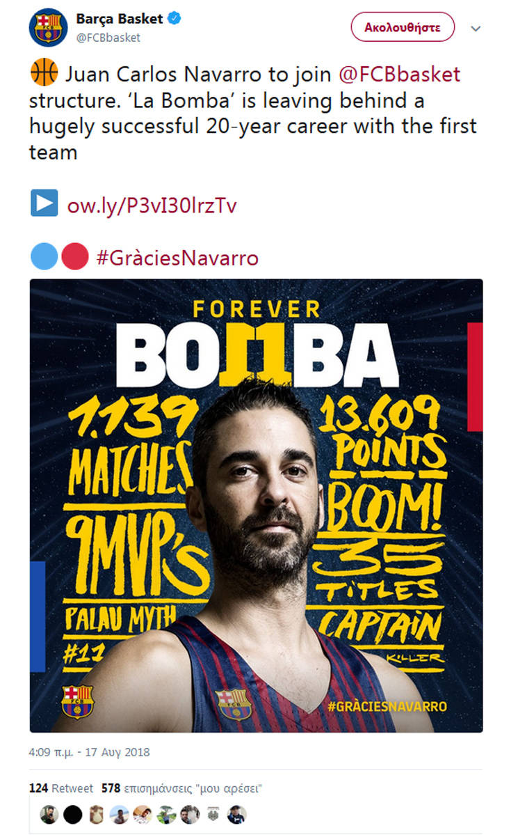 Όλα τα ωραία κάποτε τελειώνουν. Ο Χουάν Κάρλος Ναβάρο έριξε τους τίτλους τέλους στην σπουδαία καριέρα του, αφού αποφάσισε να αποσυρθεί από το μπάσκετ και πλέον θα αναλάβει διοικητικό πόστο στην Μπαρτσελόνα. Την είδηση ανακοίνωσε ο καταλανικός σύλλογος, με τον «La Bomba» να αφήνει το άθλημα μετά από 20 χρόνια με ομαδικές και ατομικές διακρίσεις. Πλέον, θα προσφέρει από ένα άλλο πόστο και θέλει και εκεί να έχει την επιτυχία που είχε σαν παίκτης. Στην καριέρα του έχει πάρει δύο φορές τη Euroleague με την Μπαρτσελόνα (2003 και 2010), ενώ το 2009 ήταν MVP της regular season της Euroleague και το 2010 MVP του Final 4. Μετρά επίσης οκτώ πρωταθλήματα Ισπανίας και επτά Κύπελλα, ενώ τρεις φορές έχει βγει πολυτιμότερος στους τελικούς της ACB (2009, 2011, 2014). Mε την εθνική Ισπανίας έχει φορέσει στο στήθος τρία χρυσά (δύο σε Eurobasket 2009 και 2011, αλλά και ένα σε Μουντομπάσκετ κόντρα στην Εθνική μας το 2006), τέσσερα ασημένια και τρία χάλκινα σε μεγάλες διοργανώσεις (Ολυμπιακούς Αγώνες, Ευρωμπάσκετ και Μουντομπάσκετ). Συνολικά έπαιξε σε 1.139 ματς, σημείωσε 13.609 πόντους και πανηγύρισε 35 τίτλους. Ο Ναβάρο φιγουράρει στην πρώτη θέση της λίστας με τις συμμετοχές, τους πόντους και τα τρίποντα, αλλά και σε ranking στην ιστορία της Euroleague. Το μπάσκετ χάνει έναν τεράστιο παίκτη, που ήξερε τον τρόπο να… βομβαρδίζει το αντίπαλο καλάθι, ειδικά με την «μπομπίτα» του.