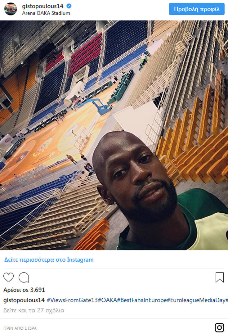 Ο Αμερικανός φόργουορντ ανέβασε τη σχετική φωτογραφία στο Instagram σχολιάζοντας: «Θέα από τη θύρα 13. Οι καλύτεροι οπαδοί της Ευρώπης. Νέα σεζόν. Η καλύτερη στιγμή της χρονιάς».