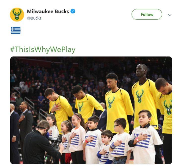 Μάλιστα, τις δύο ομάδες συνόδευσαν στο παρκέ μικρά παιδιά, τα οποία φορούσαν μπλουζάκια με την ελληνική σημαία, τα οποία είχαν επάνω τους και το σήμα των Πίστονς. Οι Μπακς, από την πλευρά τους, ανάρτησαν στο Twitter ένα μήνυμα στο οποίο κυριαρχεί η σημαία της χώρας μας και συνοδεύτηκε με το hashtag «Αυτός είναι ο λόγος που παίζουμε».